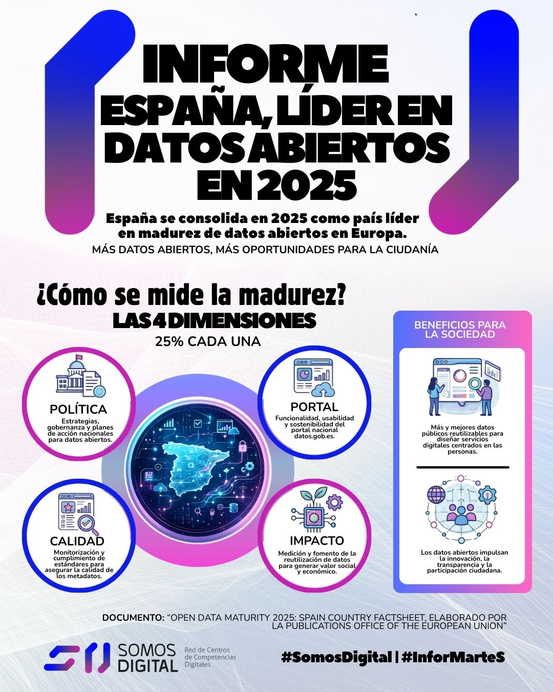 Según el «Open Data Maturity 2025: Spain country factsheet» elaborado por la Publications Office of the European Union (Oficina de Publicaciones de la Unión Europea), España se sitúa en 2025 entre los países europeos con mayor madurez en datos abiertos.