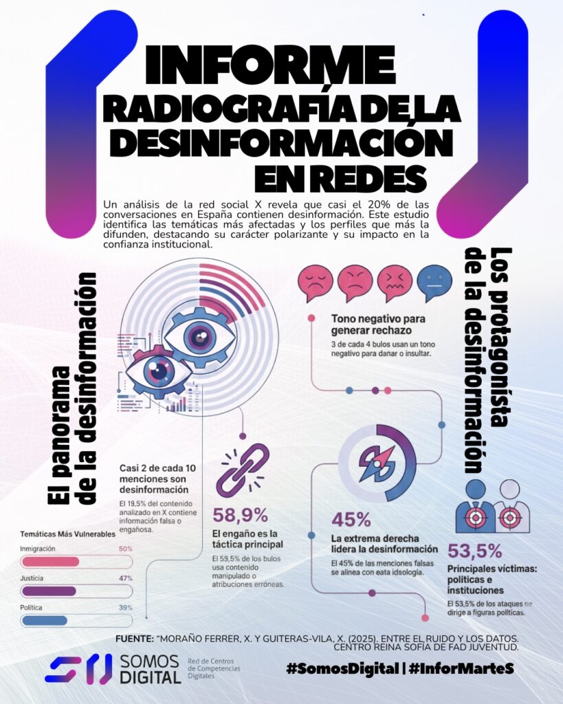 El informe de Moraño Ferrer y Guiteras-Vila (2025). «Entre el ruido y los datos». Centro Reina Sofía de Fad Juventud. analiza más de 1.000 menciones en X y radiografía uno de los fenómenos clave del ecosistema digital actual: la desinformación que impacta directamente en la juventud.