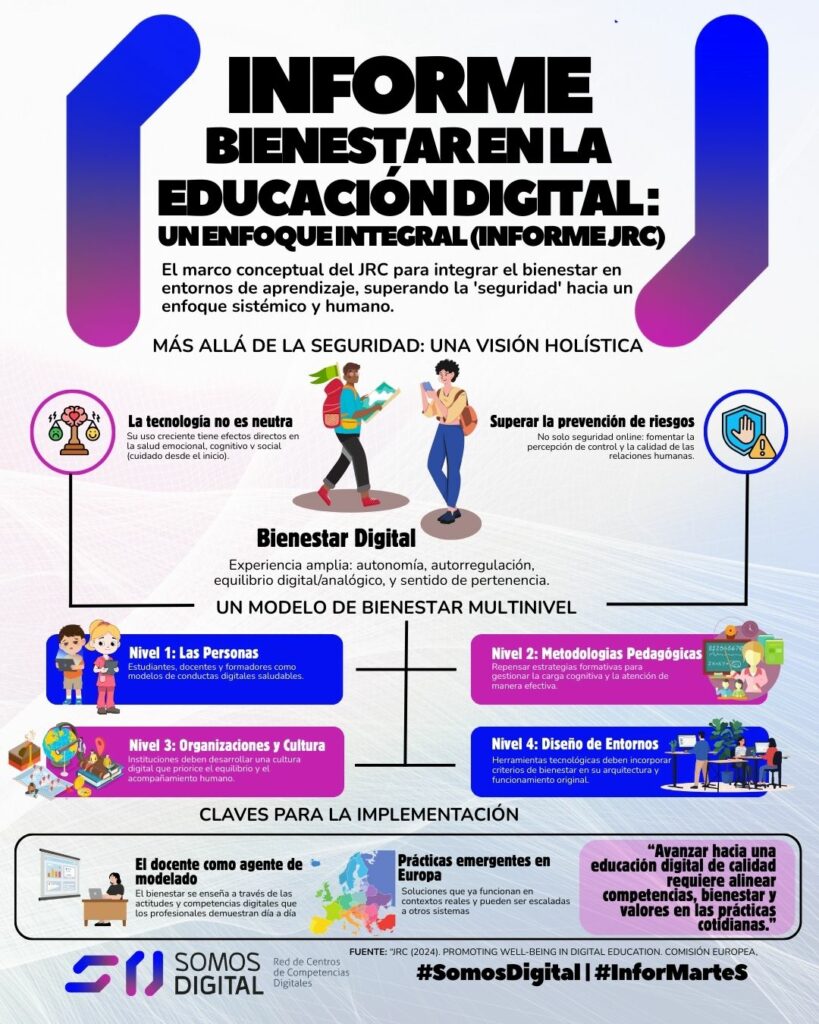 Un nuevo informe del Centro Común de Investigación (JRC) de la Comisión Europea propone un modelo europeo para integrar el bienestar en la educación digital, poniendo a las personas en el centro y promoviendo prácticas digitales más conscientes, saludables y sostenibles.