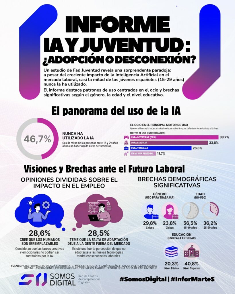 La IA avanza a toda velocidad en el mercado laboral, pero su uso entre las personas jóvenes sigue siendo desigual y, en muchos casos, anecdótico. El estudio “Inserción laboral juvenil: aspiraciones, preocupaciones y desafíos”, elaborado por Fad Juventud y Fundación Pfizer, revela que el 46,7% de jóvenes de 15 a 29 años no ha utilizado nunca una herramienta de inteligencia artificial.